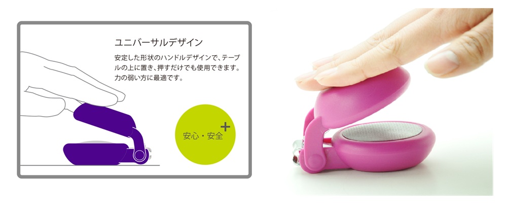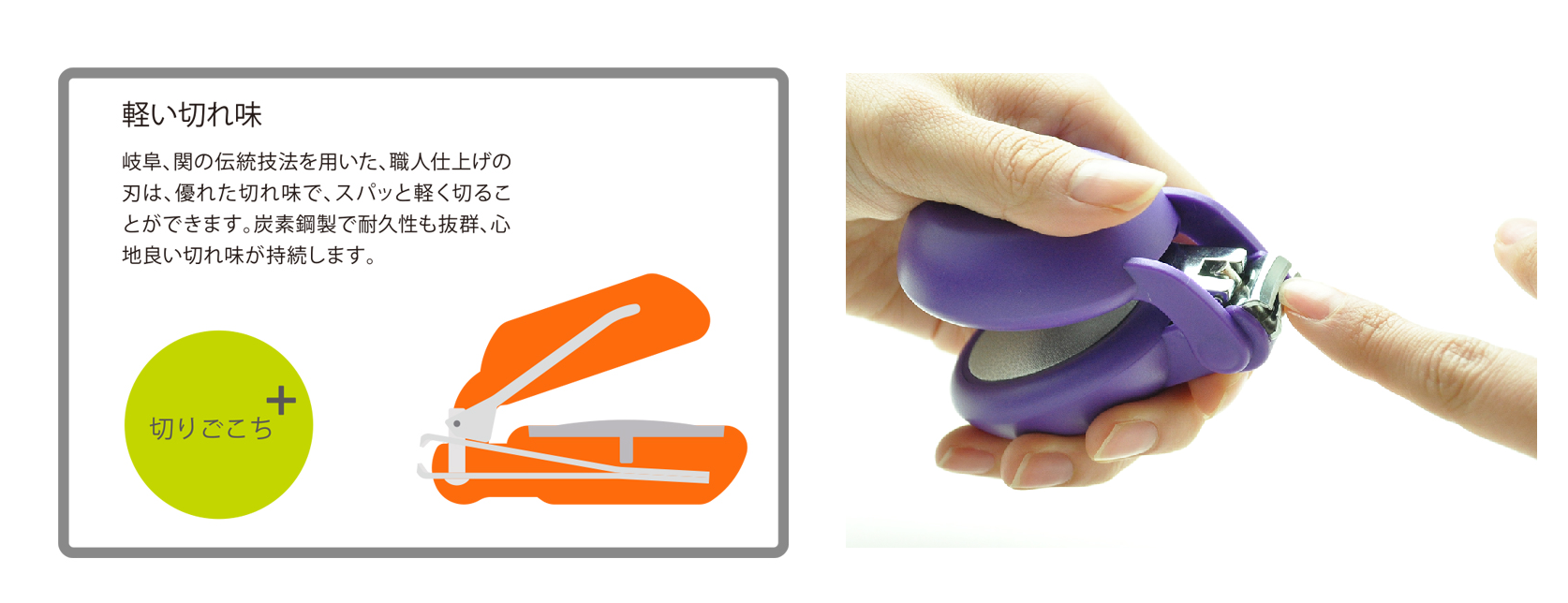 握力の弱い幼児や年配の方も安心して使用できる ユニバーサルデザイン設計の爪切りです。