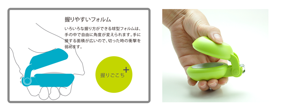 特徴としては、球型フォルムのボディで握りやすく軽いタッチで爪を切ることができます。